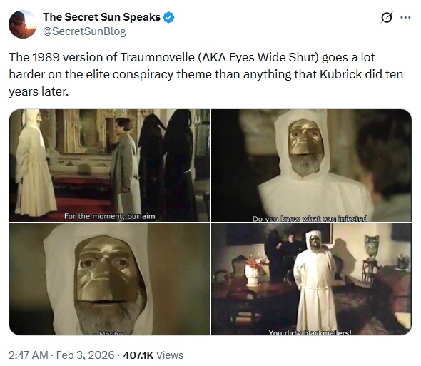 The 1989 version of Traumnovelle (AKA Eyes Wide Shut) goes a lot harder on the elite conspiracy theme than anything that Kubrick did ten years later.