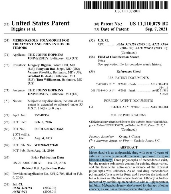 On Sep.7, 2021, Johns Hopkins University in Baltimore, MD secured a patent for MEBENDAZOLE for this use: