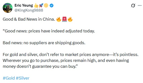 Comment: Eric Yeung is based in Hong Kong and due to his extensive contacts, knows whats really going on in the chinese PM market. Also: Prices of PM bars in dollars during the 30th Jan 2026 PM crash on China's largest e-commerce platform http://JD.com (gold bar equivalent to $5720.79/oz, and the silver bar is equivalent to $163.35/oz) Link.